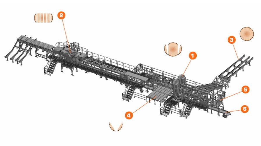 Každá linka Wood-Mizer TITAN je navržena tak, aby optimálním způsobem uspokojila konkrétní potřeby zákazníka. Tato linka TITAN, instalovaná v polském dřevozpracujícím podniku zahrnuje svislou pilu se dvěma pilovými pásy TV6000 s hydraulickým obracečem kmene (1), vícenásobné dělení (multirip) MR3000 se stolem soustřeďujícím hranoly (2), vodorovnou rozmítací pilou HR500, plošinou pro kmeny (3), dopravní plošinou krajinek (4), plošinou operátora (5) a dopravníkem pro sběr pilin (6) pro celou linku.